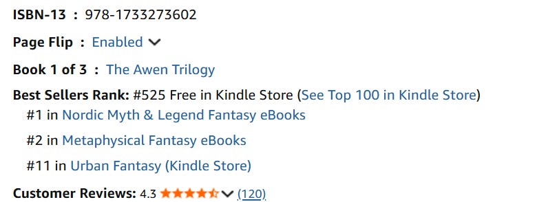 Did I get new reviews? Yes! Awen Rising has a new 5-star rating, bringing it up to 121. Hopefully, more are coming for all five books.