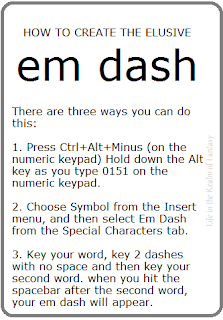 I have been writing "professionally" for ten years—and am just now learning about em dashes. Those of you with creative writing degrees are probably laughing and saying, "Whaaaat?!?!"